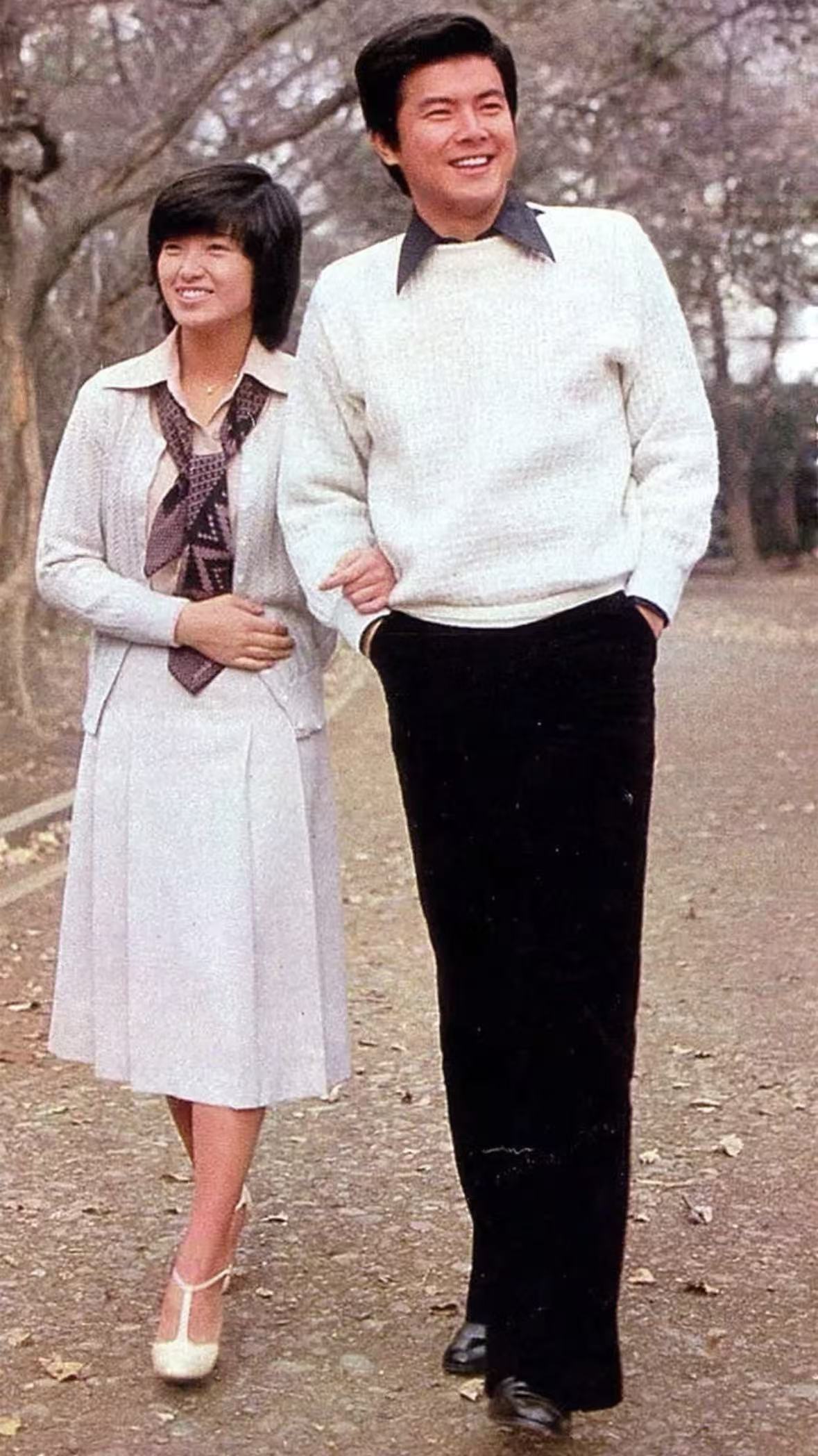 三浦友和则以白毛衣配黑灯芯绒裤,深色尖领内搭露出领口,二人穿搭色调和谐、风格简约,尽�年代经典情侣的清新知性。